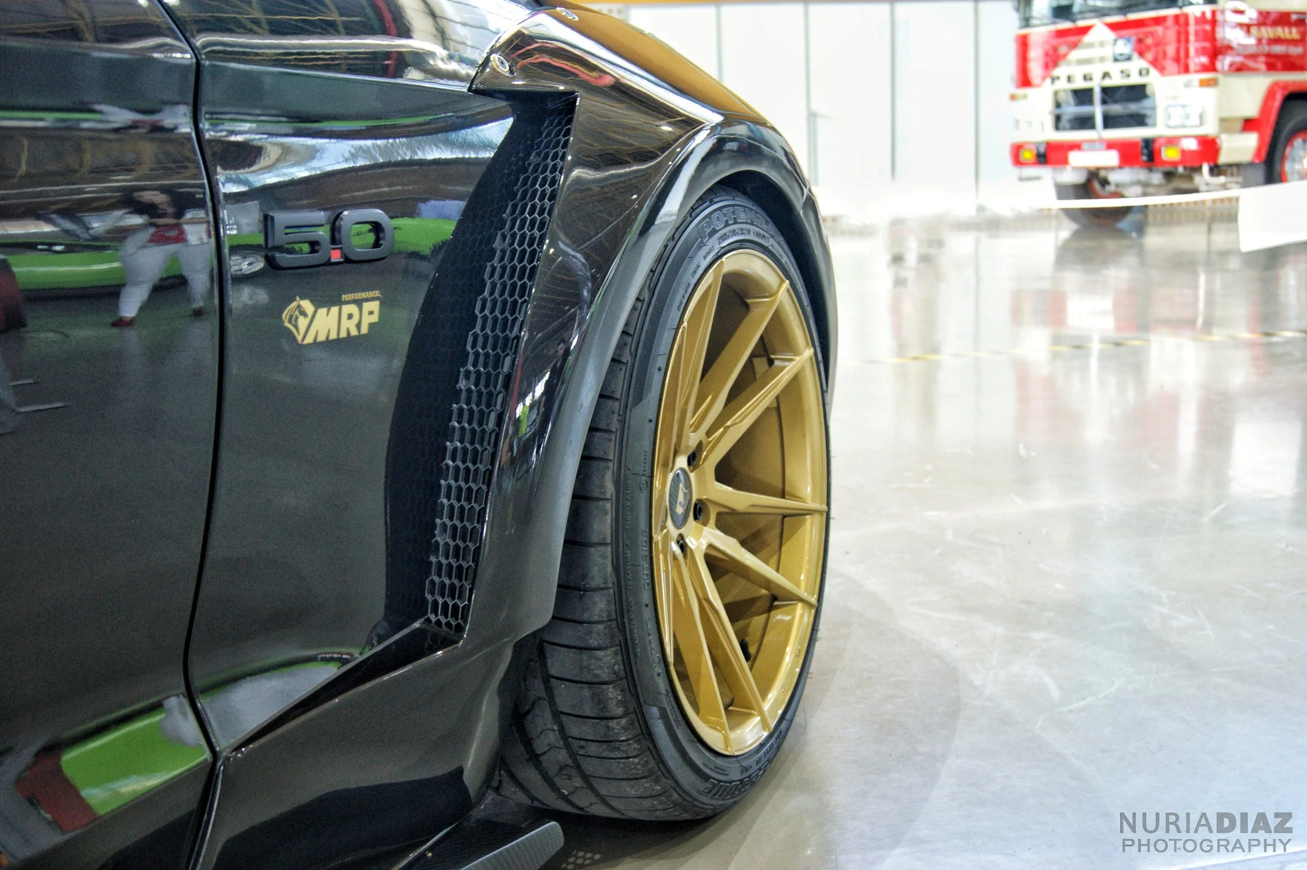 Las llantas de 20″ han sido pintadas en polvo color especial oro satinado con neumáticos Bridgeston Potenza. Las taloneras, spoiler delantero, difusor trasero le ha sido realizado un acabado look carbono.